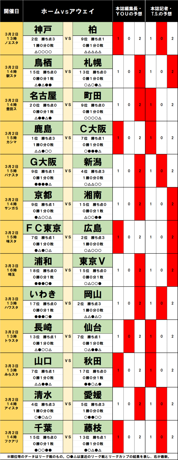 100円で億「サッカー批評」のtoto予想(第1433回)3月2・3日 昨季王者ヴィッセル神戸を止める柏レイソル「ドロー力」 東京ヴェルディが浦和レッズ「鬼門のホーム攻略」 J2復帰の愛媛FC「オレンジダービー」 (3/3ページ) 1ページ目から読む サッカー批評編集部 J1 J2 ヴィッセル神戸 柏レイソル 東京ヴェルディ 浦和レッズ 2024.03.01 【画像】100円で「億り人」になる大チャンス『サッカー批評』編集部「今週末のJ1J2予想」はコチラ! 画像/サッカー批評編集部 【画像の記事に戻る】 1 2 3 さっかーひひょうへんしゅうぶ サッカー批評編集部 1998年4月に創刊。「素晴らしいプレーと拮抗する興奮を、言葉で伝えることができたらと思う。サッカーをプレーする時、観戦する時と同様の情熱を持って、読んでもらえることを願っている」という創刊時の精神をそのままにWebでも記事を展開。日本サッカー協会100周年にあたっての「JFA100周年表彰」の媒体賞を受賞。 関連記事 「大谷さんと合わせて入籍発表か」J1新潟DFが大谷翔平の結婚報告と“サイレントコラボ”で祝福&大反響! 新婚夫婦2ショットにも「奥さま小顔で可愛らしい」の声 サッカー批評編集部 「相変わらずって感じで安心」「4コマのオチ」浦和レッズが選手とのコラボスタグル発売も、“ある選手のクセの強さ”にサポーターはまさかの安堵の声! 一見すると戸惑う姿も安心させる一枚 サッカー批評編集部 大住良之の「この世界のコーナーエリアから」第132回「サッカーの聖地」ウェンブリー物語(4) 南野、冨安、香川、岡崎、岩淵ほか遠藤より早く栄光に近づいた日本人選手たち 大住良之 【開幕戦で完敗の浦和が埼スタ開幕戦で持つべきもの (2)】東京V戦が“ヘグモレッズ”の試金石に――「まだ0勝1敗。0点なので」と酒井が語るチャレンジャー精神
