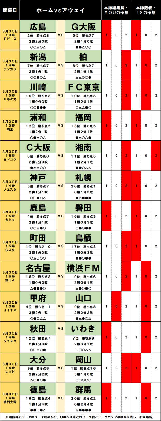 100円で億「サッカー批評」toto予想(第1441回)3月30日 3連敗・札幌VS王者・神戸、完封負け3つ・名古屋VSシュート激減・横浜FM、3位・C大阪VS暴れん坊・湘南!岡山他J2上位陣に波乱! (3/3ページ) 1ページ目から読む サッカー批評編集部 J1 J2 横浜F・マリノス 名古屋グランパス 湘南ベルマーレ 大分トリニータ 2024.03.28 【画像】100円で「億ゲット」のチャンス!『サッカー批評』編集部「今週末のJ1J2」toto予想はコチラ↓ 画像/サッカー批評編集部 【この画像の記事に戻る】 1 2 3 さっかーひひょうへんしゅうぶ サッカー批評編集部 1998年4月に創刊。「素晴らしいプレーと拮抗する興奮を、言葉で伝えることができたらと思う。サッカーをプレーする時、観戦する時と同様の情熱を持って、読んでもらえることを願っている」という創刊時の精神をそのままにWebでも記事を展開。日本サッカー協会100周年にあたっての「JFA100周年表彰」の媒体賞を受賞。 関連記事 【神奈川ダービー直前・特別対談(2)】川崎・大南拓磨と横浜FM・松原健が語る「警戒する相手選手」「ゲン担ぎ」「サポーターの重み」――「等々力劇場っていう言葉があるぐらい…」 サッカー批評編集部 【神奈川ダービー直前・特別対談(1)】川崎・大南拓磨と横浜FM・松原健が語る神奈川ダービー時のチームの雰囲気とは…「ロッカーの中からみんながすごい声を出していつもと違う」 サッカー批評編集部 「期待の大型新人」鈴木愛理さんのJ1磐田に入社にサポーター騒然! 兄はJ1湘南の元磐田DFで、「兄が退団したら、まさかの妹さんが入社するなんて」と驚きの声 サッカー批評編集部 【U23日本代表が浮かび上がらせる、パリ五輪への光と影(2)】“ベストメンバー”で挑めない最終予選の戦い方と、宮本恒靖新会長が「サッカー強国になっていくため」と語る道程