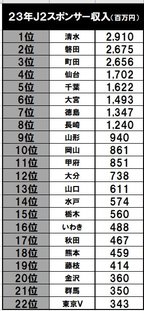J2クラブの首位は清水エスパルスで29億1000万円。2位はジュビロ磐田の26億7500万円、3位は町田ゼルビアの26億5600万円となっている。