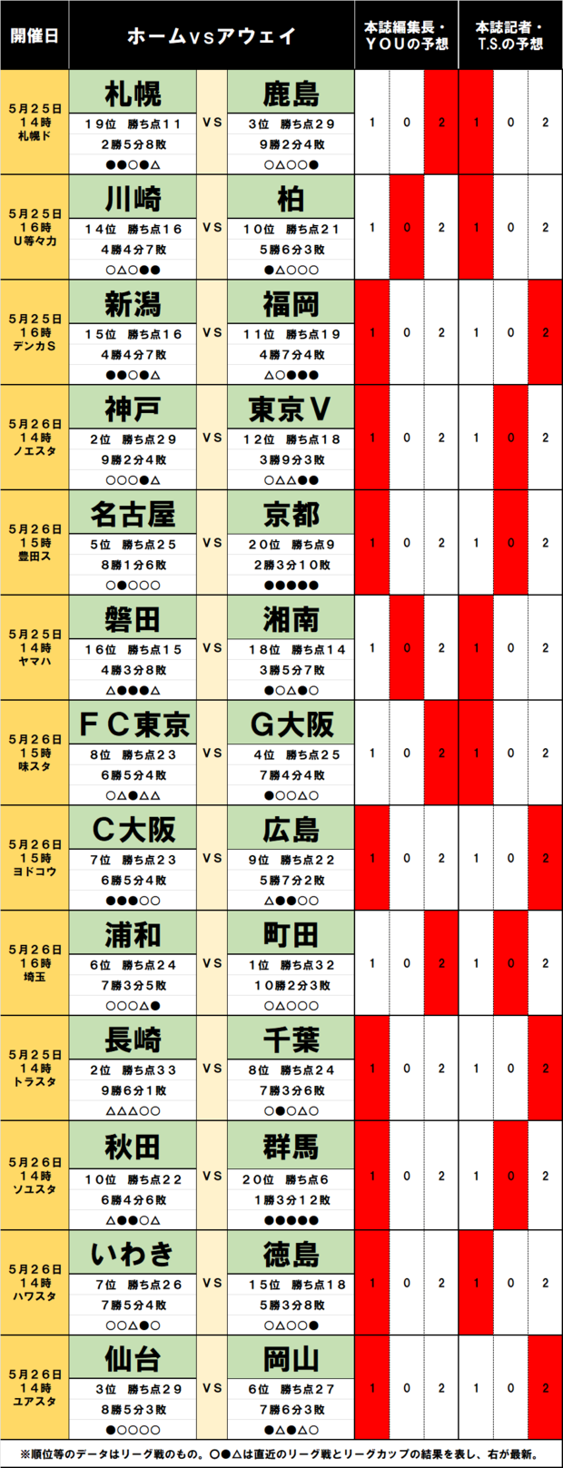 100円で億「サッカーくじ」toto予想(第1456回)5月25・26日 「降格圏の19位」札幌VS「王者・神戸撃破」鹿島、FC東京VSガンバ大阪「東西バトル」は監督力に注目! (3/3ページ) 1ページ目から読む サッカー批評編集部 J1 J2 北海道コンサドーレ札幌 鹿島アントラーズ FC東京 ガンバ大阪 2024.05.23 【画像】100円で「億ゲット」のチャンス!『サッカー批評』編集部「5月25日26日のJ1J2」toto予想はコチラ↓ 画像/サッカー批評WEB編集部 【この画像の記事に戻る】 1 2 3 さっかーひひょうへんしゅうぶ サッカー批評編集部 1998年4月に創刊。「素晴らしいプレーと拮抗する興奮を、言葉で伝えることができたらと思う。サッカーをプレーする時、観戦する時と同様の情熱を持って、読んでもらえることを願っている」という創刊時の精神をそのままにWebでも記事を展開。日本サッカー協会100周年にあたっての「JFA100周年表彰」の媒体賞を受賞。 関連記事 「胸熱。涙が出そうになった」W杯メンバーおちゃらけ町野修斗が見せた「もうひとつの顔」!「パーソナリティ出過ぎなんよw」「本当に元気出る」などの声 サッカー批評編集部 「なんかスゲェな」J1鹿島の国立決戦「古舘節」にファン興奮!「かっこ良すぎて鳥肌たった」「ゴール前の羅生門は意味わからなさすぎて笑う」などの声 サッカー批評編集部 ジュビロ磐田戦「なぜ浦和レッズは4連勝を逃したのか?」(2)レッズ中島翔哉「コーナーキックからの先制」とミスマッチ、ジュビロ「同点弾を生んだ」難しいクロス 川本梅花 ジュビロ磐田戦「なぜ浦和レッズは4連勝を逃したのか?」(1) レッズ大畑歩夢、チアゴ・サンタナらの決定機を阻んだジュビロ「熱い男」と「全員守備」、「後半勝負」 川本梅花