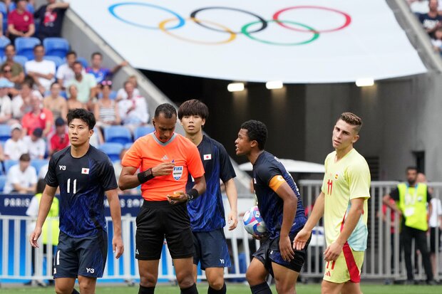 細谷真大(左)の「あの得点」が決まっていたら…そう考えない日本人はいないだろう。藤田主将(右から2番目)は冷静にレフェリーに食い下がり、ゴールを決めた細谷は天を仰いだ。撮影/渡辺航滋(Sony α‐1)