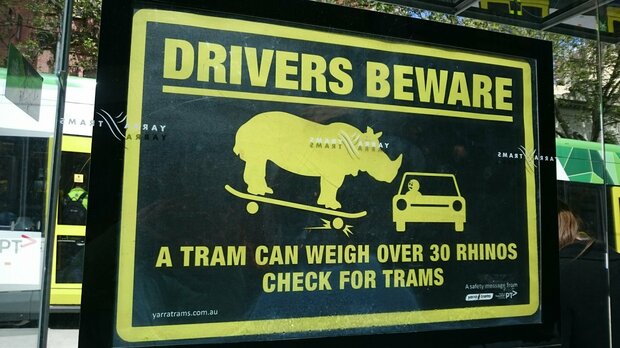メルボルンのトラム停留所にあった「サイ」の図。 路面電車は「サイ30頭分」の危険があると注意を促している。提供/後藤健生