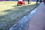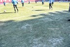 さらに、ピッチ自体のコンディションも驚くべきもの。なんと、芝には霜が降りており、ところどころ凍結しているのだ。水をまく場所では、芝の滑りを良くすための水が凍ってしまって別な意味で滑りやすくなっており、氷の塊が散乱している場所もある。強めに歩けば、バンバンと音を立てるほどに硬い。