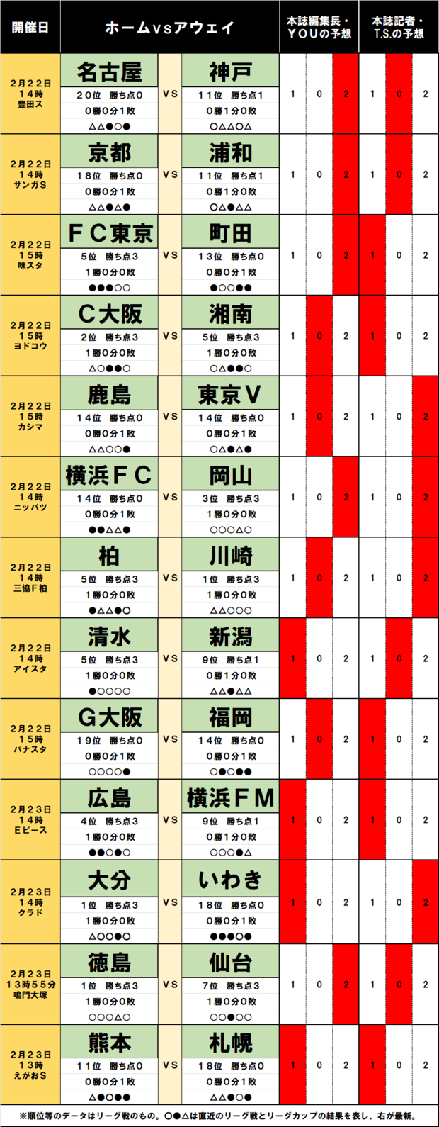 サッカーくじ「toto」予想(第1516回)2月22・23日(2)「最多失点」G大阪が「金新監督」福岡に勝利、「連敗は一度」東京Vが「鬼木新監督」鹿島に勝利、「43%」J2徳島と仙台は (3/3ページ) 1ページ目から読む サッカー批評編集部 J1 J2 ガンバ大阪 鹿島アントラーズ 東京ヴェルディ Jリーグ 2025.02.20 ■【画像】100円で「億獲り」のチャンス『サッカー批評』編集部「2月22日23日のJ1、J2」toto予想はコチラ↓ 画像/サッカー批評WEB編集部 【この画像の記事に戻る】 1 2 3 さっかーひひょうへんしゅうぶ サッカー批評編集部 1998年4月に創刊。「素晴らしいプレーと拮抗する興奮を、言葉で伝えることができたらと思う。サッカーをプレーする時、観戦する時と同様の情熱を持って、読んでもらえることを願っている」という創刊時の精神をそのままにWebでも記事を展開。日本サッカー協会100周年にあたっての「JFA100周年表彰」の媒体賞を受賞。 サッカーくじ「toto」予想(第1516回)2月22・23日 サッカーくじ「toto」予想(第1516回)2月22・23日(1)「新戦力」サヴィオら躍動の浦和は「岡山にJ1初白星」京都と、「3連覇」を目指す神戸は「川崎に大敗」名古屋と4シーズン連続 関連記事 「食べるのためらうレベル」J1広島が発売した「リアル過ぎるサンフレッチェメロンパン」が大反響!「可愛すぎてこれは買いだなあ」「すごぉぉぉい!!!」の声 サッカー批評編集部 「素敵な写真」「素敵夫婦♡」J2仙台MFによる結婚報告「新婚夫婦手つなぎ2ショット」が大反響!「そんな笑ってるの初めて見ました」「幸せオーラが溢れていますね」の声 サッカー批評編集部 川崎・長谷部茂利監督が「ターンオーバー」と「ハードワーク」の言葉を使わない理由とは……指揮官に聞いた、メディアやファン・サポーターも含めて注目されている“ワード認識” サッカー批評編集部 「見直しが必要」なJ1残留争い、「交代もうまい」新潟監督、「評価が低すぎる」岡山GK、「鹿島に勝った」湘南、「再起」期待の横浜FC鈴木武蔵【2025Jリーグ「開幕」の激論】(3) 大住良之 後藤健生