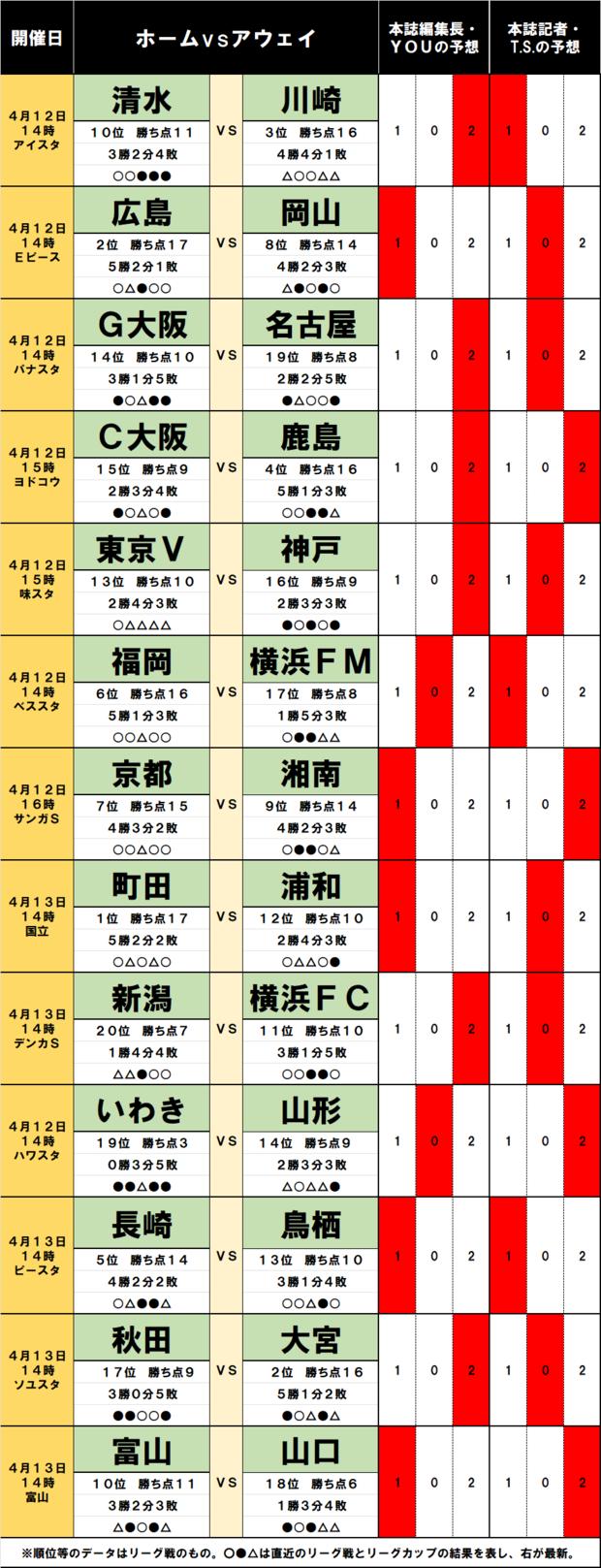 サッカーくじ「toto」予想( 第1529回)4月12・13日(2)首位を目指す川崎を待つ「2つ」の落とし穴、「名門」が首位に立つも…柏や福岡も「躍進」で上位はさらなる混戦へ (3/3ページ) 1ページ目から読む サッカー批評編集部 J1 J2 川崎フロンターレ 鹿島アントラーズ Jリーグ 2025.04.11 ■【画像】100円で「億獲り」のチャンス『サッカー批評』編集部「4月12日13日のJ1、J2」toto予想はコチラ↓ 画像/サッカー批評WEB編集部 【この画像の記事に戻る】 1 2 3 さっかーひひょうへんしゅうぶ サッカー批評編集部 1998年4月に創刊。「素晴らしいプレーと拮抗する興奮を、言葉で伝えることができたらと思う。サッカーをプレーする時、観戦する時と同様の情熱を持って、読んでもらえることを願っている」という創刊時の精神をそのままにWebでも記事を展開。日本サッカー協会100周年にあたっての「JFA100周年表彰」の媒体賞を受賞。 サッカーくじ「toto」予想( 第1529回)4月12・13日 サッカーくじ「toto」予想( 第1529回)4月12・13日(1)リーグ「真っ二つ」の珍現象の下、「下位リーグ」浦和が首位・町田を足止め!首位浮上を狙う広島の前に「中国ダービー」の壁 関連記事 「ファン・ダイクに見えたわ」森保ジャパンの20歳・190cmDF高井幸大の劇的ゴールが「高い&魂が入っている」と大絶賛!「これだけの選手はJリーグの歴史で初めてかもしれない」の弧え サッカー批評編集部 「美男美女過ぎ」「衣装かわいすぎる」イケメンJリーガーと人気女性モデルとの「衣装さまざま新婚2ショット」が大反響! ユニフォーム着用&ウエディング衣装に「どの写真も素敵」の声 サッカー批評編集部 「スーパーレジェンドコンビ」「お洒落で本当にかっこいい」日本サッカー界の「豪華すぎるカフェ2ショット」が3万いいねの大反響!「めっちゃ素敵なお写真」の声 サッカー批評編集部 大住良之の「この世界のコーナーエリアから」第161回「ロングシュートはみんなの夢」(3)「驚いた」Jリーグ屈指の天才ストライカーの「タコ顔ゴール」とワールドカップ準決勝の「37メートル弾」 大住良之