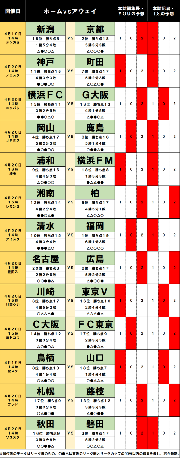 サッカーくじ「toto」予想( 第1531回)4月19・20日(2)勝ち点17で並ぶ「5チーム」、昨シーズン王者の「物差し」で分かった川崎VS東京Vの勝敗、そして満員のホームでの岡山「クラブ史上初」 (3/3ページ) 1ページ目から読む サッカー批評編集部 J1 J2 川崎フロンターレ ファジアーノ岡山 Jリーグ 2025.04.18 ■【画像】100円で「億獲り」のチャンス『サッカー批評』編集部「4月19日20日のJ1、J2」toto予想はコチラ↓ 画像/サッカー批評WEB編集部 【この画像の記事に戻る】 1 2 3 さっかーひひょうへんしゅうぶ サッカー批評編集部 1998年4月に創刊。「素晴らしいプレーと拮抗する興奮を、言葉で伝えることができたらと思う。サッカーをプレーする時、観戦する時と同様の情熱を持って、読んでもらえることを願っている」という創刊時の精神をそのままにWebでも記事を展開。日本サッカー協会100周年にあたっての「JFA100周年表彰」の媒体賞を受賞。 サッカーくじ「toto」予想( 第1531回)4月19・20日 サッカーくじ「toto」予想( 第1531回)4月19・20日(1)首位から9位まで「勝ち点3差」の大混戦、1位の福岡が清水の「勢い」に呑まれるも…2位の京都を襲う「唯一の中2日」、首位浮上は 関連記事 「女神のように美しい」元サッカー日本代表の鹿島アントラーズMF柴崎岳の美人アイドル妻、“34歳の誕生日報告”近影に反響「こんな可愛いママいいな〜」 サッカー批評編集部 「クール系に見えるのにこの熱い感じ堪んない」J1浦和の北欧出身DFの円陣での激にファン感動!「もはやリーダーやん!」「『いくぞ』聞くたびにちょっと泣きそうになる」などの声 サッカー批評編集部 「流石の貫禄‥」J1京都の「スーツが似合うトップ5」に称賛続々!「よしのり、社長さんみたい」「オフィスドラマ作れそうな布陣」などの声 サッカー批評編集部 「本当にありがたい」川崎・4戦未勝利も長谷部茂利監督、アウェイに駆け付けたサポーターに感謝。「勝てなかった申し訳なさもありますが、ともに歩んでアジア青覇に向かっていけたら」 サッカー批評編集部