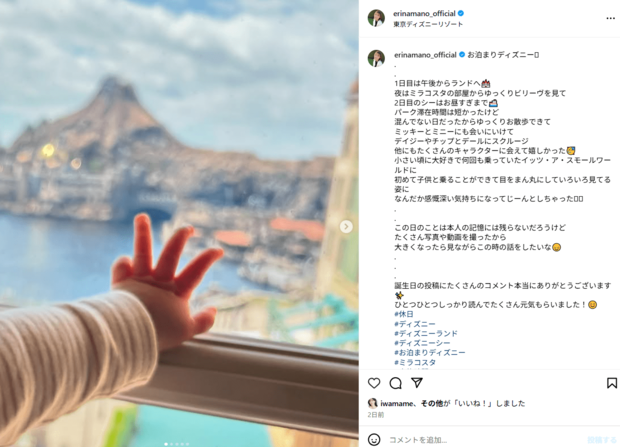 「真野ちゃんの子どもが……」元サッカー日本代表の鹿島アントラーズMF柴崎岳の美人アイドル妻、“お泊まりディズニー”で「じーんとしちゃった」 (3/3ページ) 1ページ目から読む サッカー批評編集部 J1 鹿島アントラーズ 柴崎岳 2025.04.22 ■【画像】「全部が可愛い」柴崎岳ファミリーの“お泊まりディズニー”満喫ショット 柴崎と協力しながら、子育てに励んでいる真野。家族でリフレッシュする時間は大切! この投稿をInstagramで見る 真野恵里菜 Erina Mano(@erinamano_official)がシェアした投稿 ※画像は真野恵里菜のインスタグラムより 【この画像の記事に戻る】 1 2 3 さっかーひひょうへんしゅうぶ サッカー批評編集部 1998年4月に創刊。「素晴らしいプレーと拮抗する興奮を、言葉で伝えることができたらと思う。サッカーをプレーする時、観戦する時と同様の情熱を持って、読んでもらえることを願っている」という創刊時の精神をそのままにWebでも記事を展開。日本サッカー協会100周年にあたっての「JFA100周年表彰」の媒体賞を受賞。 関連記事 「女神のように美しい」元サッカー日本代表の鹿島アントラーズMF柴崎岳の美人アイドル妻、“34歳の誕生日報告”近影に反響「こんな可愛いママいいな〜」 サッカー批評編集部 「ママになってますます綺麗に」元サッカー日本代表の鹿島アントラーズMF柴崎岳の美人アイドル妻、ゆる巻き髪の最新ショット公開&子どもの成長明かす サッカー批評編集部 「血を受け継いでおる…!」元サッカー日本代表の鹿島アントラーズMF柴崎岳の美人アイドル妻、我が子への“英才教育”に反響「ムチムチがたまらない」 サッカー批評編集部 元サッカー日本代表の鹿島アントラーズMF柴崎岳の美人アイドル妻、親子で新年初の推し活!熱狂オタぶりに反響「納得とか同意とか親近感とかいろいろ伝わってくる」 サッカー批評編集部