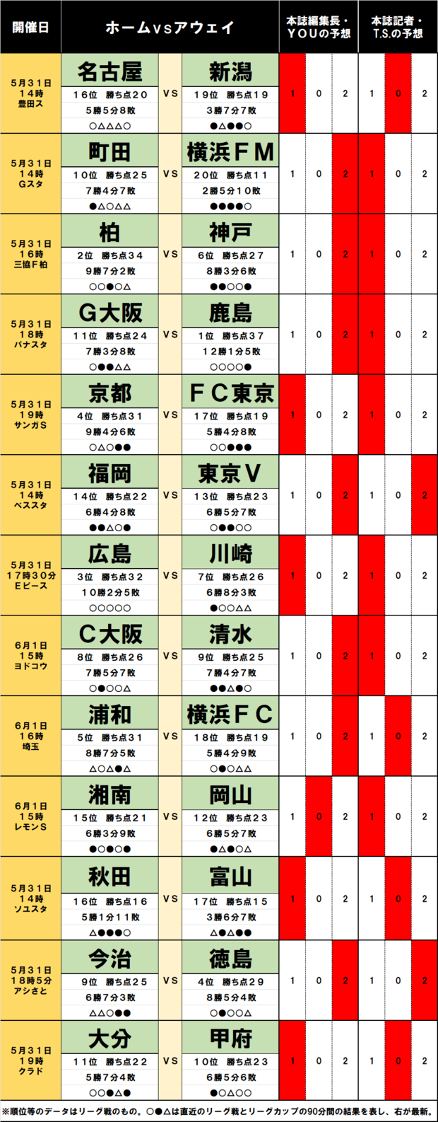 サッカーくじ「toto」予想(第1542回)5月31日・6月1日(2)強い鹿島が「今季2度目」で首位争い過熱、G大阪「勝負を分ける」後半ゴール、「終盤に強い」川崎と広島、決め手は「満員御礼」か (3/3ページ) 1ページ目から読む サッカー批評編集部 J1 J2 浦和レッズ 柏レイソル 川崎フロンターレ サンフレッチェ広島 2025.05.30 ■【画像】100円で「億獲り」のチャンス『サッカー批評』編集部「5月31日・6月1日のJ1、J2」toto予想はコチラ↓ 画像/サッカー批評WEB編集部 【この画像の記事に戻る】 1 2 3 さっかーひひょうへんしゅうぶ サッカー批評編集部 1998年4月に創刊。「素晴らしいプレーと拮抗する興奮を、言葉で伝えることができたらと思う。サッカーをプレーする時、観戦する時と同様の情熱を持って、読んでもらえることを願っている」という創刊時の精神をそのままにWebでも記事を展開。日本サッカー協会100周年にあたっての「JFA100周年表彰」の媒体賞を受賞。 サッカーくじ「toto」予想(第1542回)5月31日・6月1日 サッカーくじ「toto」予想(第1542回)5月31日・6月1日(1)「クラブW杯」浦和は「降格圏」横浜FCと壮行試合、「思い」と「本数」が勝負を決める、「2連覇中」王者は「2位」柏のお得意様 関連記事 「ナニコレwwwwwwww」J1名古屋の「マツケンサンバ」ユニフォームに驚愕広がる!「ここまでコラボするんかww」「3万か。。。ほしい」などの声 サッカー批評編集部 「すぐに誰かわかりますね」人気サッカー解説者の顔も中身も変わらぬ子ども時代に称賛の声!「もう顔が出来上がってる・・・」「当時からサッカーマニアの片鱗を見せていたのね」などの声 サッカー批評編集部 「すぐ売れそう、かっこよすぎる」J1神戸が発表した「白×黒復刻の夏限定ユニフォーム」に賛辞続々!「3色とも欲しい…」「襟付き!!より昔のやつっぽくて良い!!」の声 サッカー批評編集部 「カッコイイ!代表ユニ感あるね」J2千葉が発表した「粋すぎるデザインの夏限定特別ユニフォーム」が大反響!「滅茶苦茶カッコ良すぎる」「デザインが良い!!」の声 サッカー批評編集部