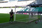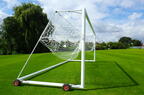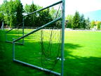 ところが、グラウンド面から垂直に立つ支柱だけは外してあった。そこで強度を保つために「下面」のゴールライン上を除く3方を太いパイプでつなぎ、さらにその内側にゴールラインから2メートルほどのところにもう1本、太いパイプを渡していた、大会の初期にその2本目のパイプに頭をぶつけて痛がっていた選手がいたが、大丈夫だったのだろうか。