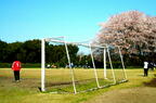 立川市にあるこのグラウンドは、タッチライン際に大きな桜の木があり、季節には満開の桜が選手たちの心を奪う(【写真08】)。ときどき困るのは、この木が大きくピッチ上まで枝を広げていることである。前線に送ろうとしたロングパスが、盛大に花吹雪を散らしながら、あらぬところに落ちることがある。その場合には、プレーを続けさせるか、相手側のスローインにするか、主審が独断で決めるのである。