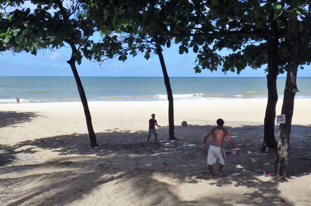 そして【写真21】は、自分が撮った中で最も好きな写真の1枚だ。2013年、ブラジルで開催された「FIFAコンフェデレーションズカップ」の大会中に、レシーフェのボアビアージェン海岸で出合ったシーンだ。父と子だろうか。2人が浜辺の木陰でボールを蹴っている。父がシューター、息子はGK。息子の背後にある2本の木が、2人のゴールだ。