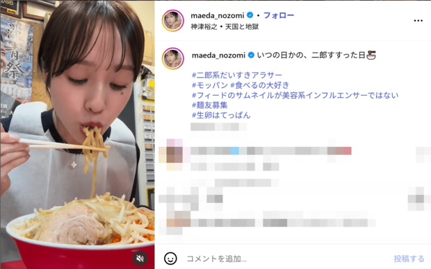 「食べっぷり最高」浦和MF渡邊凌磨の元“おはガール”美人モデル妻、二郎系ラーメン爆食モッパン動画が沸騰 (3/3ページ) 1ページ目から読む サッカー批評編集部 J1 浦和レッズ 2025.09.19 ■【画像】「もぐもぐかわいいよぉ」浦和MF渡邊凌磨の元“おはガール”美人モデル妻、二郎系ラーメン爆食姿 女の子らしさ満点のキュートなビジュアルながらも、二郎系ラーメンを一心不乱に食すというギャップで魅了した渡邊凌磨の妻・前田希美。これからも、いろんな”まえのん”を見てみたい。 ※画像は前田希美のインスタグラムより、以下同 この投稿をInstagramで見る 前田希美 まえのん(@maeda_nozomi)がシェアした投稿 【この画像の記事に戻る】 1 2 3 さっかーひひょうへんしゅうぶ サッカー批評編集部 1998年4月に創刊。「素晴らしいプレーと拮抗する興奮を、言葉で伝えることができたらと思う。サッカーをプレーする時、観戦する時と同様の情熱を持って、読んでもらえることを願っている」という創刊時の精神をそのままにWebでも記事を展開。日本サッカー協会100周年にあたっての「JFA100周年表彰」の媒体賞を受賞。 関連記事 「美背中も美腹も素敵」浦和MF渡邊凌磨の元“おはガール”美人モデル妻、背中開きコーデ&夫婦ショット公開「電車使ってること知れて嬉しい」の声も サッカー批評編集部 「こりゃ綺世も絶好調なるわ」日本代表FW上田綺世、美人モデル妻との夫婦ハワイVlogが沸騰「なんなのこのかわいい2人」「一生見てられる」 サッカー批評編集部 「可愛すぎて震えます」日本代表10番・堂安律の美人妻、大胆美くびれ&デコルテ見せの華やかドレスショット公開「最後の照れ顔もかわいい」 サッカー批評編集部 日本代表DF谷口彰悟の美人妻、大物女優との奇跡の遭遇ショットに「2人とも美人すぎる」大反響!和服姿に「綺麗な新妻」「京都画報やね」の声 サッカー批評編集部