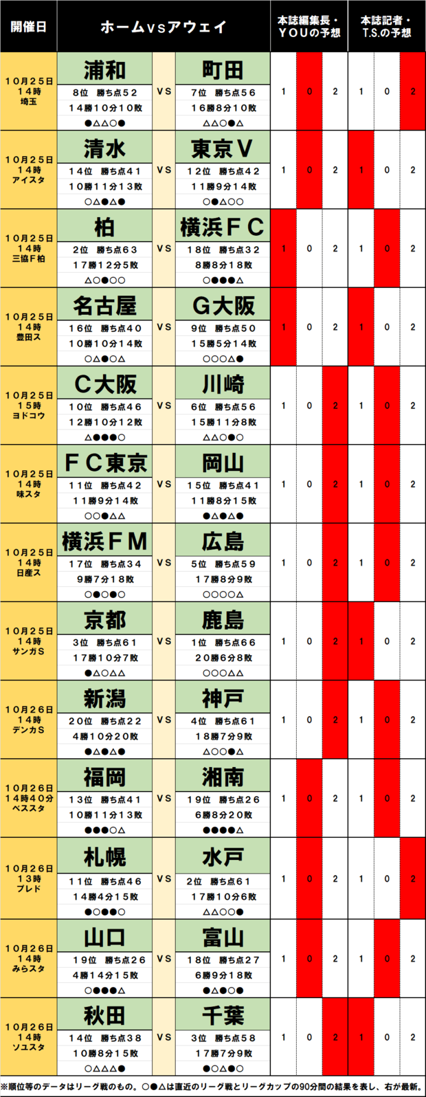 サッカーくじ「toto予想」(第1582回)10月25・26日(2)優勝争い継続を狙う広島の前に鬼門が待つ!残留争いの3チームは明暗分かれる (3/3ページ) 1ページ目から読む サッカー批評編集部 J1 サンフレッチェ広島 横浜F・マリノス 湘南ベルマーレ アルビレックス新潟 2025.10.24 ■【画像】100円で「億獲り」のチャンス『サッカー批評』編集部「10月25・26日のJ1、J2」toto予想はコチラ↓ 画像/サッカー批評WEB編集部 この画像の記事に戻る 1 2 3 さっかーひひょうへんしゅうぶ サッカー批評編集部 1998年4月に創刊。「素晴らしいプレーと拮抗する興奮を、言葉で伝えることができたらと思う。サッカーをプレーする時、観戦する時と同様の情熱を持って、読んでもらえることを願っている」という創刊時の精神をそのままにWebでも記事を展開。日本サッカー協会100周年にあたっての「JFA100周年表彰」の媒体賞を受賞。 サッカーくじ「toto予想」(第1582回)10月25・26日 サッカーくじ「toto予想」(第1582回)10月25・26日(1)首位鹿島を相手に「フルハウス」が京都の背中を押す!追う2位柏には「まさかの難敵」降格圏の横浜FC 関連記事 元日本代表のJ2・RB大宮FW杉本健勇プロデュースグッズが完売御礼!「センスが超絶良い」「第2弾もあるなんて…破産」 サッカー批評編集部 埼玉スタジアムJ1浦和VS川崎戦「ビジター自由席7600円」「ホーム自由席2700円」の価格は妥当なのか?(1)【北中米ワールドカップの「チケット代」が高すぎる件】(1) 大住良之 「残留」と「優勝」を追い求める激戦! 湘南FW鈴木章斗のエース証明弾! PK失敗、一発レッドも京都が執念の同点弾!“痛み分け”の日曜日【湘南ベルマーレvs京都サンガF.C.】激闘PHOTOギャラリー 原壮史 痛恨ドローも「心が震える」「最高のチーム」と熱狂! 京都・曺貴裁監督が拡声器を手にサポーターを鼓舞!「首位鹿島戦、最高の試合になる予感」 サッカー批評編集部