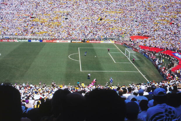 ロサンゼルス近郊のパサデナにある「ローズボウル・スタジアム」で行われたブラジル×イタリアの決勝戦。イタリアの5番手ロベルト・バッジョがボールに向かう。これが上に外れ、ブラジルの4回目の優勝が決まった。アメリカンフットボールの競技場では、手前のタッチラインやコーナーが見えないところがいくつもあった。©Y.Osumi