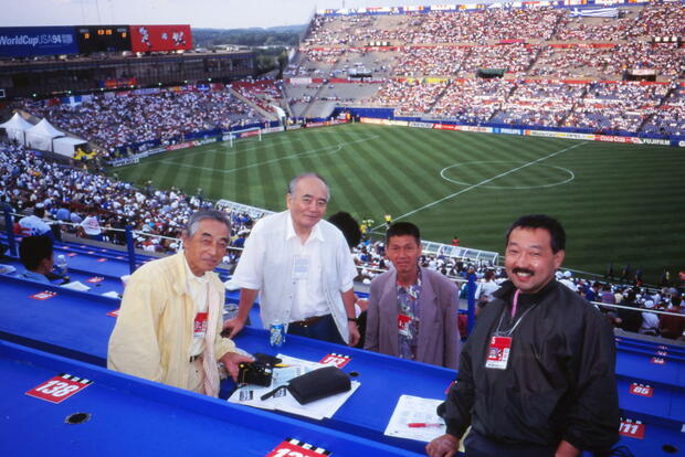 ボストンのフォックスボロ・スタジアムで、日本のベテラン記者たちと。左から賀川浩さん(当時69歳)、中条一雄さん(当時68歳)、荒井義行さん(当時57歳)。皆さん故人となられた。右端の私(筆者)は、当時42歳だった。©Y.Osumi