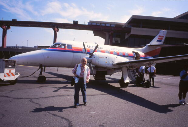 ワシントンからの移動は、ベテラン記者の中条一雄さんと一緒だった。中条さんの背後に見えるのが、私たちをボストンまで運んだ19人乗りのプロペラ機である。©Y.Osumi