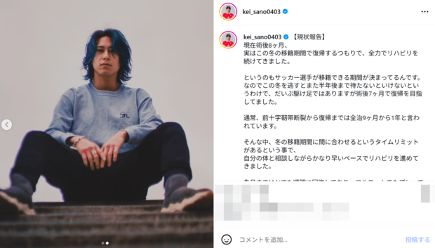 “双子の兄が人気俳優”プロサッカー選手、前十字靭帯断裂からスピード復帰目前も延期に!神秘的ブルーヘア姿で想い綴る「サッカーの神様がいるとしたら、ぶん殴ってやりたい」 (2/2ページ) 1ページ目から読む サッカー批評編集部 2026.01.15 ■【画像】“双子の兄が人気俳優”プロサッカー選手、神秘的なブルーヘアの爆イケ近影 イメチェンした、少し伸びたブルーヘアでカメラに写る佐野選手。その視線の先には、近い将来、完全復活した自分の姿を見ているのかもしれない。 ※画像は佐野渓のインスタグラムより 【この画像の記事に戻る】 1 2 さっかーひひょうへんしゅうぶ サッカー批評編集部 1998年4月に創刊。「素晴らしいプレーと拮抗する興奮を、言葉で伝えることができたらと思う。サッカーをプレーする時、観戦する時と同様の情熱を持って、読んでもらえることを願っている」という創刊時の精神をそのままにWebでも記事を展開。日本サッカー協会100周年にあたっての「JFA100周年表彰」の媒体賞を受賞。 関連記事 「選手生命を覚悟」プレーオフ1戦目で負傷『仮面ライダー鎧武/ガイム』佐野岳の双子イケメン弟・プロサッカー佐野渓、手術成功を報告「曲がらない膝」で激痛も…リハビリに奮闘中 サッカー批評編集部 「バリバリ現役で夢追いかけてます」プロサッカー選手の佐野渓、『仮面ライダー鎧武/ガイム』イケメン俳優の双子兄と“お揃い金髪姿”で誕生日報告 サッカー批評編集部 「ガクくんそっくり!」『仮面ライダー鎧武/ガイム』佐野岳の双子イケメン弟・プロサッカー選手の佐野渓、美人妻とキスも…アツアツなウェディングフォト公開! サッカー批評編集部 「似てますね」驚きの声!『仮面ライダー鎧武/ガイム』佐野岳の双子のイケメン弟・プロサッカー選手の佐野渓、美人妻&娘との3ショット公開「家族の為に全力で闘います!!」 サッカー批評編集部 「どこぞの組長ですかww」J3福島加入会見登場のキングカズが圧倒的迫力!「イケすぎてる」「ハードボイルドな映画が始まりそう」 サッカー批評編集部 「これキングカズのネーム入るやつ??」レジェンド加入のJ3福島の新ユニフォームに注目集まる!「凄いな…!!!」「俺の中では優勝です」 サッカー批評編集部 「ゴージャスなお母さんにそっくり」キングカズ次男が公開した“ラブタイム”ファミリー集合ショットに「映画のワンシーンみたい」 サッカー批評編集部 日本代表DF谷口彰悟の美人妻、大物女優との奇跡の遭遇ショットに「2人とも美人すぎる」大反響!和服姿に「綺麗な新妻」「京都画報やね」の声 サッカー批評編集部