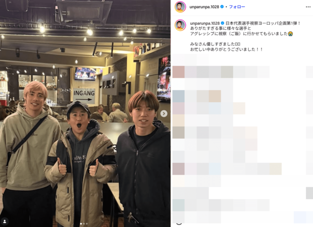 「すごいメンツ!」超人気TikTokerウンパルンパ、伊東純也ら日本代表と“ヨーロッパでご飯”!激レアショットに「生純也いいな〜」 (3/3ページ) 1ページ目から読む サッカー批評編集部 海外 日本代表 伊東純也 三戸舜介 橋岡大樹 伊藤敦樹 2026.02.28 ■【画像】超人気TikTokerウンパルンパ、伊東純也ら日本代表選手らと“ヨーロッパでご飯”へ 超人気 TikTokerクリエイターのウンパルンパ。念願かなった憧れの選手とのレアショットに、本人のみならずファンも胸アツの様子だが、『ヨーロッパ企画第2弾』が楽しみだ! ※画像はウンパルンパのインスタグラムより、以下同 この投稿をInstagramで見る ウンパルンパ(@unparunpa.1028)がシェアした投稿 【この画像の記事に戻る】 1 2 3 さっかーひひょうへんしゅうぶ サッカー批評編集部 1998年4月に創刊。「素晴らしいプレーと拮抗する興奮を、言葉で伝えることができたらと思う。サッカーをプレーする時、観戦する時と同様の情熱を持って、読んでもらえることを願っている」という創刊時の精神をそのままにWebでも記事を展開。日本サッカー協会100周年にあたっての「JFA100周年表彰」の媒体賞を受賞。 関連記事 「あれは純也のゴールです」伊東純也がPK献上も名誉挽回“ほぼ決勝弾”でゲンクを欧州16強へ導く!「10番の意地が炸裂して得点を呼び込んだ」「精神力めっちゃかっこいい」 サッカー批評編集部 「こんな可愛いママおるんか」日本代表エース上田綺世のモデル妻、韓国発トレンド“ハッシュカット”で美人度アップ「天才的に似合ってます」絶賛の嵐 サッカー批評編集部 大ケガから完全復活を目指す“なでしこ切り札”サッカー界のレディー・ガガ、まだらヘアのイメチェン姿公開も筋力テストの結果に撃沈 サッカー批評編集部 「尊い…」日本のファンへ向けたゲンク伊東純也の“感謝メッセージ”動画に反響!「そんな純也スマイルで言われたら」「応援が届いてて良かった」「嬉しすぎるので保存」 サッカー批評編集部