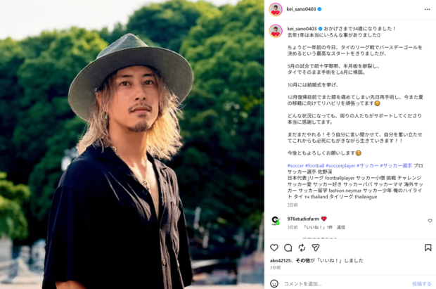 「双子の兄は人気俳優」プロサッカー選手、34歳誕生日にロン毛&ヒゲのワイルド爆イケショット公開!2度の手術から復帰を目指す姿にエール殺到 (2/2ページ) 1ページ目から読む サッカー批評編集部 2026.04.08 ■【画像】「双子の兄が人気俳優」プロサッカー選手、ロン毛&ヒゲのワイルド爆イケショット 二度の手術を経てもなお夏の移籍を見据え、ピッチへの復帰に向けて懸命にリハビリに励む佐野渓。その不屈の姿に、ファンから熱いエールが送られている。 ※画像は佐野渓のインスタグラムより、以下同 【この画像の記事に戻る】 1 2 さっかーひひょうへんしゅうぶ サッカー批評編集部 1998年4月に創刊。「素晴らしいプレーと拮抗する興奮を、言葉で伝えることができたらと思う。サッカーをプレーする時、観戦する時と同様の情熱を持って、読んでもらえることを願っている」という創刊時の精神をそのままにWebでも記事を展開。日本サッカー協会100周年にあたっての「JFA100周年表彰」の媒体賞を受賞。 関連記事 “双子の兄が人気俳優”プロサッカー選手、前十字靭帯断裂からスピード復帰目前も延期に!神秘的ブルーヘア姿で想い綴る「サッカーの神様がいるとしたら、ぶん殴ってやりたい」 サッカー批評編集部 「バリバリ現役で夢追いかけてます」プロサッカー選手の佐野渓、『仮面ライダー鎧武/ガイム』イケメン俳優の双子兄と“お揃い金髪姿”で誕生日報告 サッカー批評編集部 「ガクくんそっくり!」『仮面ライダー鎧武/ガイム』佐野岳の双子イケメン弟・プロサッカー選手の佐野渓、美人妻とキスも…アツアツなウェディングフォト公開! サッカー批評編集部 「臨場感が増しますね!」聖地ウェンブリーでの三笘薫の歴史的ゴール“ピッチレベル映像”に反響!「芸術」「一連の流れが洗練されてて無駄がなくて美しい」 サッカー批評編集部 名将トゥヘルが白旗!イングランド側の証言で分かった日本代表「本当の恐ろしさ」(1)「三笘へのパス供給を断つしかない」名将が戦慄した「プレスをかけるのが難しい」日本のシステム 田嶋コウスケ 名将トゥヘルが白旗!イングランド側の証言で分かった日本代表「本当の恐ろしさ」(2)英FWの絶望とアーセナルOBが絶賛した中村敬斗、英メディアが報じた「0.0」と完璧な決勝点 田嶋コウスケ 「またゴール決めてる」バイエルン谷川萌々子の冷静右足弾&ピンポイント左足クロスでの1G1Aが貫禄たっぷり!「はっきり言って別格」「クロスの質たけー」と称賛続々 サッカー批評編集部 「しまむら本気出しすぎてる」Jリーグとの“安心価格”のコラボ商品が拡大!「仕事のネクタイはこれしかない」「シャワーサンダルはちょうど買い替えたかった」と話題 サッカー批評編集部 【画像19枚】なでしこの至宝から欧州女王へ!アジア杯優勝の谷川萌々子とマンU宮澤ひなたが欧州CLで激突!バイエルン熱狂の夜を現地撮 原壮史 【現地写真100枚】伊東純也&三笘薫の決勝弾から駆けつけた南野拓実&遠藤航の姿まで!初招集、復活組、主力組も躍動!森保ジャパン「英国遠征」厳選ショット 渡辺航滋 「集合写真きたぁぁぁ!最高」歴史的勝利の森保ジャパン“聖地ウェンブリー”でのサポーターとの集合ショット公開!「鎌ちゃんもこの笑顔」「菅原顔キメすぎだろw」 サッカー批評編集部 「MOMは中村選手!! 」聖地で炸裂した“敬斗ゾーン”からの右足一閃!「惜しい!」「本番ではぜひ」イングランド撃破の立役者がビッグクラブへ サッカー批評編集部 トルシエ&ザック歓喜!日本代表のイングランド撃破、聖地ウェンブリーでの“歴代監督集結”セルフィーに反響「エモすぎて涙が…」 サッカー批評編集部 「勝利の女神健在!」日本代表の聖地ウェンブリーでの歴史的勝利を“新婚美女”が現地観戦! ユニフォームショット公開に「可愛いです♪」「また女神世界がザワつくぞ」 サッカー批評編集部