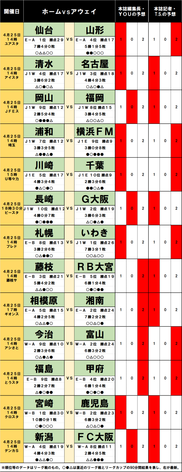 サッカーくじ「toto予想」(第1624回)4月25日(2)因縁の東北ダービーで仙台が山形に…千葉も川崎に「守護神」の後押し! (3/3ページ) 1ページ目から読む サッカー批評編集部 J1 J2 ジェフユナイテッド千葉 川崎フロンターレ ベガルタ仙台 モンテディオ山形 2026.04.24 ■【画像】100円で「億獲り」のチャンス『サッカー批評』編集部「4月25日のJ1、J2・J3百年構想リーグ」toto予想はコチラ↓ ※画像:サッカー批評WEB編集部 この画像の記事に戻る 1 2 3 さっかーひひょうへんしゅうぶ サッカー批評編集部 1998年4月に創刊。「素晴らしいプレーと拮抗する興奮を、言葉で伝えることができたらと思う。サッカーをプレーする時、観戦する時と同様の情熱を持って、読んでもらえることを願っている」という創刊時の精神をそのままにWebでも記事を展開。日本サッカー協会100周年にあたっての「JFA100周年表彰」の媒体賞を受賞。 サッカーくじ「toto予想」(第1624回)4月25日 サッカーくじ「toto予想」(第1624回)4月25日(1)圧倒的支持の浦和とG大阪に潜む「死角」、横浜FMと長崎が起こす波乱のシナリオ 関連記事 サッカーくじ「toto予想」(第1624回)4月25日(1)圧倒的支持の浦和とG大阪に潜む「死角」、横浜FMと長崎が起こす波乱のシナリオ サッカー批評編集部 J1昇格組決戦は水戸が再びPK戦で千葉を下す! 水戸はGK西川幸之介の好セーブからマテウス・レイリアの先制弾! 千葉は安井拓也が鮮やかなミドル弾も…【ジェフユナイテッド千葉vs水戸ホーリーホック】激闘PHOTOギャラリー 原壮史 日産スタジアムでの“神奈川ダービー”は劇的決着! 川崎が後半ATの強烈フィニッシュで横浜FMに勝利! 歓喜のエリソン&苦悩のトリコロールを現地撮り【横浜F・マリノスvs川崎フロンターレ】激闘PHOTOギャラリー 原壮史 「これはエグイなw」川崎FWエリソン、劇的すぎる豪快弾からの筋肉パフォにファン大興奮!「そのままお風呂にザブンしそう」 サッカー批評編集部 【2026年明治安田J2・J3百年構想リーグ ベガルタ仙台vs栃木シティ「グループ首位仙台の論点」】システム変更奏功で11試合6失点と堅守継続【戸塚啓のJ2のミカタ】(1) 戸塚啓 【2026年明治安田J2・J3百年構想リーグ ベガルタ仙台vs栃木シティ「グループ首位仙台の論点」】起用法の最適解を探った相良竜之介が弾丸ミドルゴール 求められるFWの底上げ【戸塚啓のJ2のミカタ】(2) 戸塚啓 J2山形の新スタジアム「ほぼ本物」模型が完成!大ピンチを乗り越えて2028年開業へ「カッコいい」「家に飾りたい」「ワクワクするね〜」 サッカー批評編集部