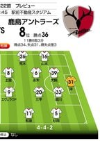 鹿島は鳥栖よりわずかに多い31失点。前節は逆転勝ちしたものの、開始13分までに苦手のセットプレーからなどで2失点。3試合連続で2失点しており、こちらはネガティブな印象の方が強い。