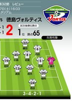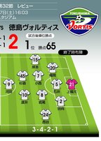 首位は徳島ヴォルティスで変わらない。東京ヴェルディとのアウェイゲームに2対1で競り勝ち、3連勝の5戦負けなしで勝点を「65」に伸ばした。