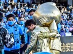 熱狂的なサポーターが集まるエリアに鬼木監督が到達すると、ふろん太がおもむろに鬼木監督に勧めるジャケットがあった。それは、黄金のジャケット。優勝を祝って、鬼木監督にそのジャケットを着るよう、仕向けたのだ。