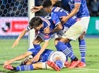 電光掲示板の横に設置された大きな時計の針は、すでに45分を指し示して動かなかった。9月26日、18時55分の等々力競技場。背番号41の左足からゴール前にクロスが上げられた瞬間、時計の針だけでなく時間までも止まったかのようだった。しかし、そのボールに反応した男がいた。FW知念慶。すでに足をつっていて、時折ピッチで足を伸ばさなければ歩けないほど疲労を抱えていた。にもかかわらず、背番号20は天高く飛び上がると、クロスを頭で叩きつけた。ゴールネットが揺れると同時に、競技場はすさまじい歓声が沸き上がった。知念は足をつって、起き上がれない。ヒーローは、サポーターと仲間に笑顔をプレゼントすると、自らは苦悶の表情となって喜ぶことすらできなかった――。