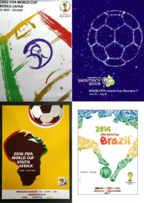 2014年ブラジル大会の公式ポスターは、ボールを奪い合う2人の選手の足がモチーフになっていて、その足やポスター上部の模様には、ブラジルを象徴する踊り、太陽、海岸、音楽、多彩な植物、多様性のある生き物などが描かれている。足の部分を見て、このころ選手たちにはやり始めていた「タトゥー」を連想してしまうのは、私だけだろうか。全体に白っぽいデザインで印象が薄いが、2選手の足と上の模様で囲まれた白い部分がブラジルの国土を表していることも、あまり知られていない。