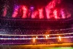 それは、選手が入場する直前のことだ。ピッチの上に最大6本の火柱が燃え上がる。さらに、国立競技場の外では花火が打ちあがる。青赤の花火が、さまざまな種類で豪雨の夜空を鮮やかに染める。青赤はもちろん、FC東京のカラー。東京五輪のメイン会場となったこのスタジアムをホームチーム色にしたのだ。