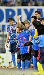 試合後に行われた授賞式では日本代表の選手が一様に笑顔。日本代表選手全員が壇上に上がると、キャプテン谷口彰悟が大会制覇のトロフィーを紙吹雪の中で掲げるなど、祝福ムードとなった。