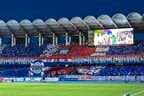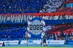 それは、選手入場の瞬間だ。他のチームとの対戦時よりも拡張されたこの日の等々力のビジター席が、青、赤、白に彩られた。さらに、中央には「2022」と書かれたシャーレのイラストも掲示された。ホーム観客席がざわつくほどで、大一番を戦う横浜の選手に強力な援護射撃をするものだった。