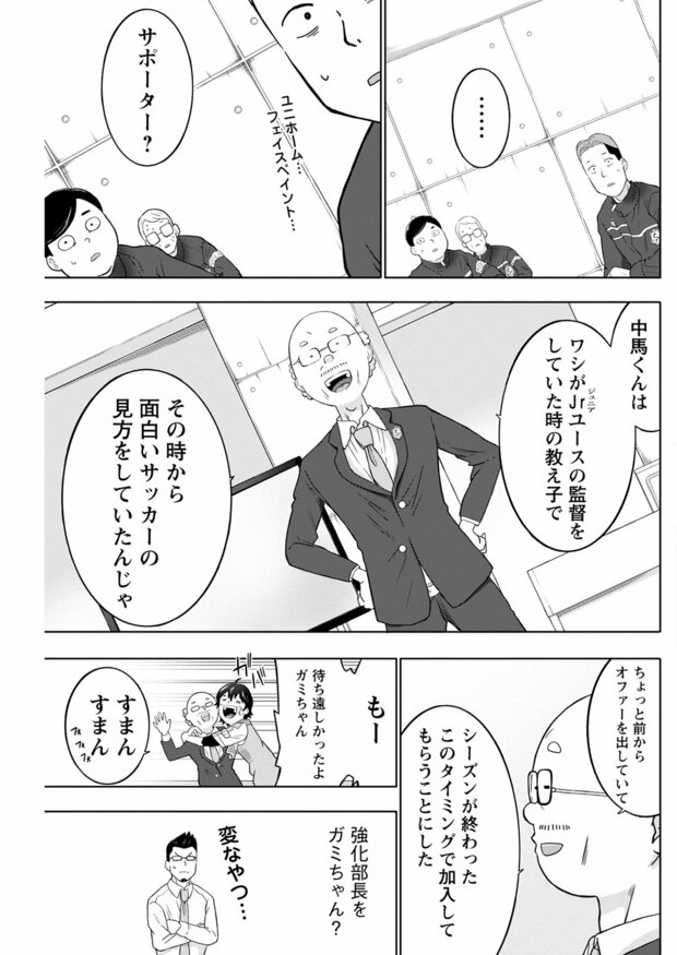 得点力不足、主力選手の怪我、監督交代などなど問題が山積み。そんな中、強化部長の大神がグランブル静岡の熱烈なサポーター・中馬学を突然「強化部」に採用して……。平凡に見える人間でもいい。このチームに必要な才能を見抜け!! 華々しく躍動する選手たちの裏で、プロサッカークラブの現在と未来のために奮闘する“強化部”の物語、堂々開幕!!