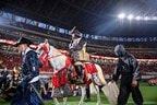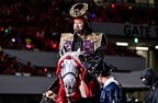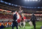 選手入場時に両チームのイレブンを出迎えるために出てきたようで、白馬から降りると両手にサッカーボールを持つ。そして、仁王立ちの状態で主審や選手をピッチに迎えたのである。