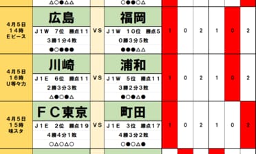 今回のtotoはJ1百年構想リーグ第9節の10試合と、J2・J3百年構想リーグ第9節の3試合が対象となっている。過去のデータや直近の様子などから、分析を進めてみよう(※totoは90分間の「勝ち」「負け」「それ以外」で予想されるため、この…