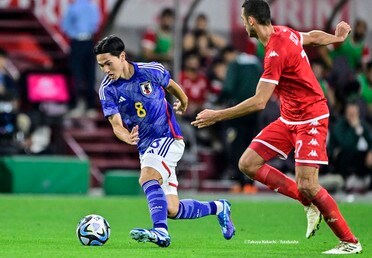 チュニジア戦はそれまでトップ下でプレーしていた久保建英が、4ー2ー3ー1の右サイドにポジションを移し、南野拓実がトップ下に入った。久保もこの日は欧州シリーズのトルコ戦と違い、ボランチの遠藤航と守田英正のサポートを得ながら、ほとんど高めの位…